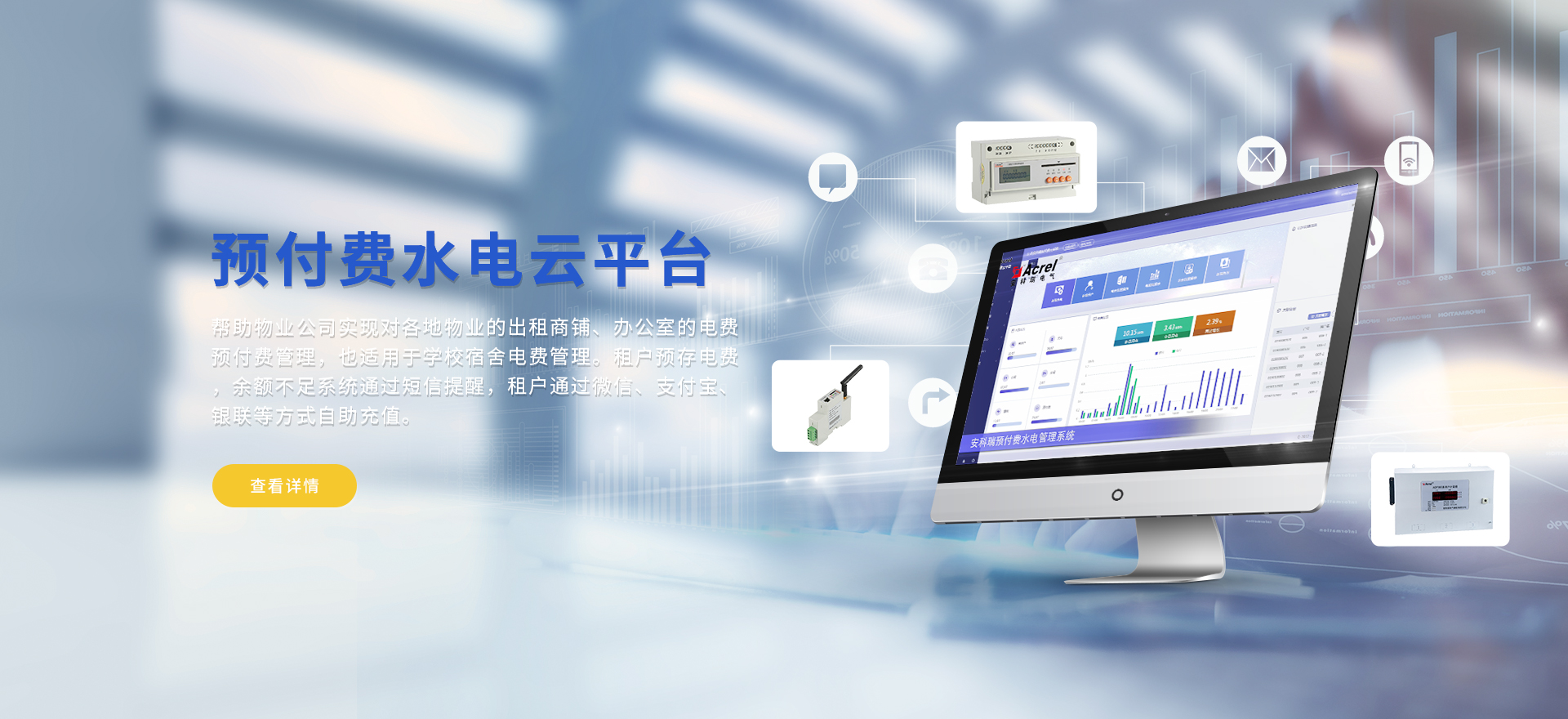 安科瑞提供的解決方案包括Acrel-EIoT能源物聯網云平臺變電所運維云平臺、安全用電管理云平臺環保用電監管云平臺、智慧消防云平臺能源管理云平臺、工業企業能源管控平臺、遠程預付費云平臺、餐飲油煙監管云平臺、電動汽車/電瓶車充電樁收費管理云平臺、電力監控/無線測溫系統、電能質量治理系統、電氣火災監控系統、消防設備電源監控系統防火門監控系統、應急照明和疏散指示系統、智能照明控制系統、醫用隔離電源絕緣監測系統等,幫助用戶實現能源智能化、可視化、精細化管理,提高用能效率和用能安全,為企業節能降耗和實現能源數字化建設提供數據服務。